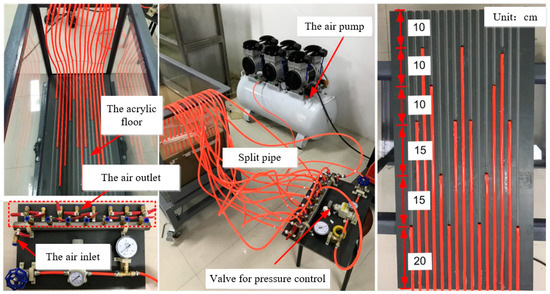 To prevent local damage caused by local application of gas, 15 ventilated rubber hoses were equally divided into three groups, as shown in Figure 6. These hoses were evenly fixed into the grooves at the bottom of the acrylic plate to achieve uniform gas distribution. The 15 rubber hoses were externally connected to the pressure control valve and ultimately, to the air source preparation machine installed next to the model box. After the gas application system was connected, the acrylic bottom plate with the rubber hose was placed at the bottom of the model box.