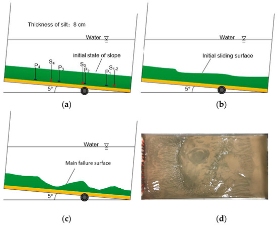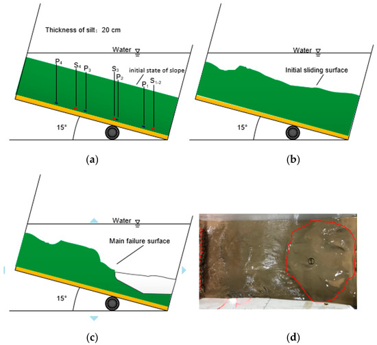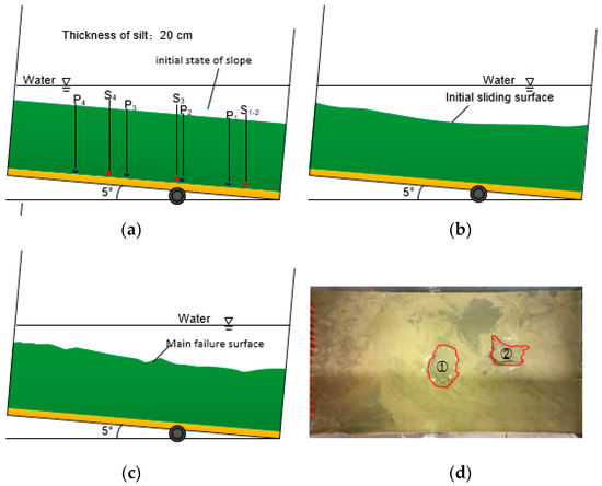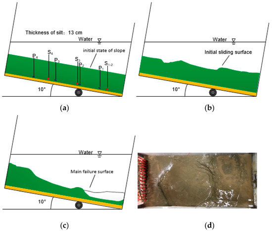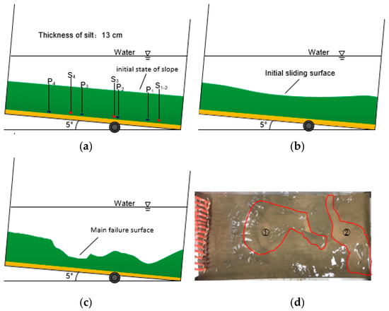 Moreover, owing to the incompatibility of sedimentary soil movement, the crack gradually develops. In addition, in the 13-10 and 13-15 models, the seabed surface exhibited obvious slip along the crack. The silt at the foot of the slope was highly mixed with water and no longer intact. The soil had strong fluidity and was in a liquefied state. In both models, the main cause of slippage of the slope may be the vertical cracks that exist inside the slope. The high excess pore pressure created by the accumulated gas causes an upward seepage pressure that promotes the movement of the water–soil mixture up the fracture, resulting in a weak sliding surface inside the soil. Eventually, the soil layer undergoes shear failure along the sliding surface. Figure 11 and Figure 12 also show that the main sliding surfaces of the slopes occur at the slight deformations caused by initial sliding.