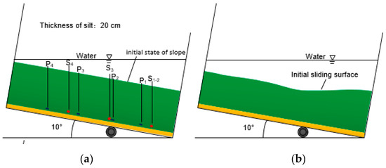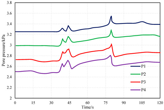 Figure 6 shows the layout details of the sensors in the model box. Four pore pressure sensors are distributed along the longitudinal axis of the model box, and P1 is located near the slope. Two earth pressure sensors (S1 and S2) are evenly installed at the slope position, and the other two earth pressure sensors (S3 and S4) are distributed along the longitudinal axis of the model box.