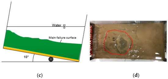 The camera was placed on the side of the model box and the height was adjusted to be flush with the model. The sensors were then connected to the DEVE-43A eight-channel data acquisition instrument to begin the process of data collection and the camera was powered on. When the data were stable, the model box was rotated to the experimental angle to start the experiment. As shown in Figure 6, the soil layer may slip slightly due to the change of the seabed slope. After the data monitored by the sensors were stabilized, timing was initiated and subsequent experiments were performed. The gas source preparation machine was then opened to generate high-pressure gas. In addition, the control valve of the gas distribution device was opened. Gas was then pumped into the model box at a fixed step size of 2 kPa per 30 s. Changes in the soil layers and data fluctuations of the pore pressure sensors were recorded. The test was terminated when significant damage occurred in the local layer (e.g., the entire slope collapsed). The slope deformation was monitored by a camera mounted next to the model box.