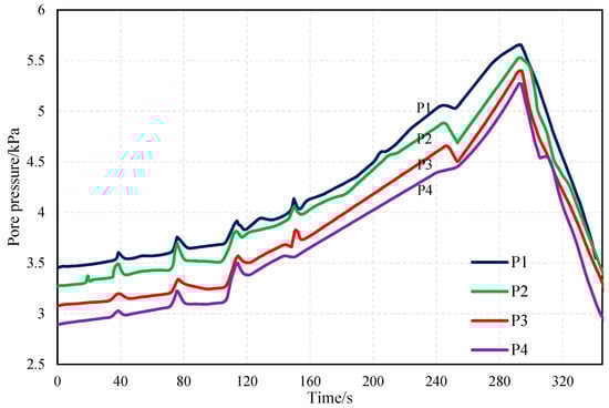 Figure 17 shows the monitored values of the pore pressure for the 13-5 model. Similar to the 20-5 model, the hydrostatic pressure at P1 is the highest. Starting from the 35th second, several consecutive increases in the value of the pore pressure indicate the disruption of the deep region of the sedimentary soil. The cracks formed by these small damages lead to the dissipation of pore pressure and create conditions for generation of continuous cracks in the soil. The cumulative dissipation frequency of pore pressure is higher compared to the 20-5 model. This may be because the soil layer is thinner and more easily disrupted, which is not conducive to the accumulation of pore pressure. At approximately 245 s, the pore pressure drops abruptly, probably because a continuous crack inside the soil provides a channel for pore pressure dissipation. At approximately the 290th second, the slope is mainly disrupted, and the P1 pore pressure drops to the initial pore pressure value after failure.