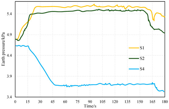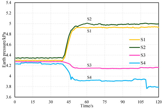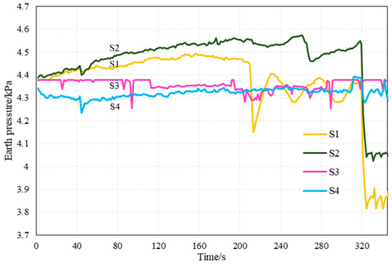 Figure 22 shows that earth pressure is unchanged at the beginning of the experiment. At 40 s, the earth pressure at S1 and S2 increased significantly, while a decrease occurred at S3 and S4. At this point, the slope may have slipped. In the final stage of the experiment, the earth pressure at S4 is again reduced to 3.79 kPa. When the formation was eventually destroyed, a large slippage occurred at the top of the slope.