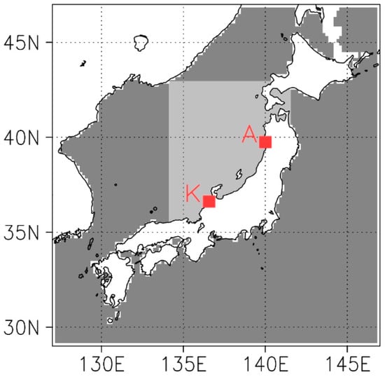 Target domains of the wave simulation. Darker region is the parent domain and brighter region is the child domain. The Nationwide Ocean Wave information network for Ports and HArbourS (NOWPHAS) observation sites at Akita and Kanazawa are indicated by red squares with initials A and K, respectively.