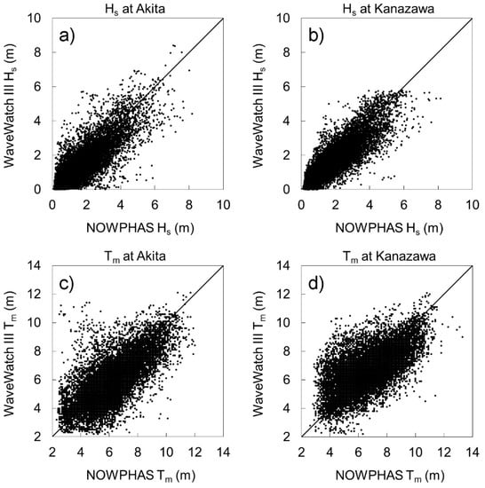 Significant wave height (Hs) and mean wave period (Tm) by NOWPHAS observation and WaveWatchIII (WW3) simulation. (a) Hs at Akita, (b) Hs at Kanazawa, (c) Tm at Akita, and (d) Tm at Kanazawa. Horizontal and vertical axes of each panel represent NOWPHAS and WW3, respectively.