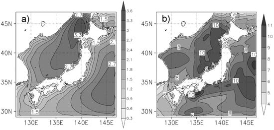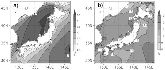 Figure 3 shows the spatial distributions of climatological significant wave height () and maximum significant wave height (Hs_max) in winter (December–February: DJF) in the parent domain during the target period for the wave simulation. Over a wide area of the Japan Sea side, along the coast is >2.1 m, whereas it is smaller (~0.9 m) along the coast on the Pacific side. In winter, strong northwesterly winds that blow over the Japan Sea cause higher ocean waves. Therefore, Hs_max in winter is >10 m over the northern half of the coastal area on the Japan Sea side, whereas it is >10 m near only a limited area of the coast on the Pacific side.