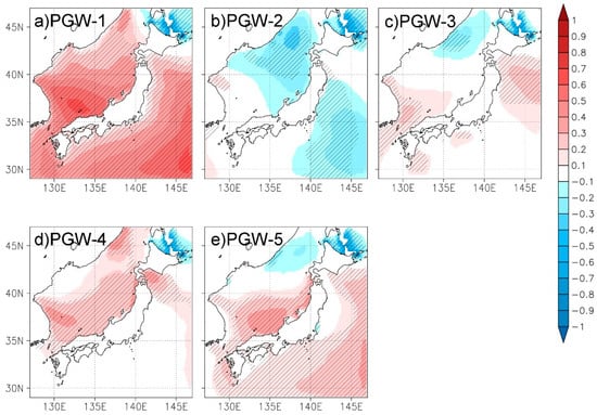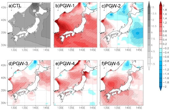 (a)–(e) Future variations of in each PGW simulation. Areas with statistically significant variation are indicated by hatching. Unit of color bar is sec.