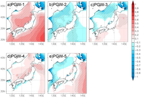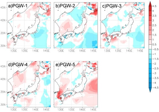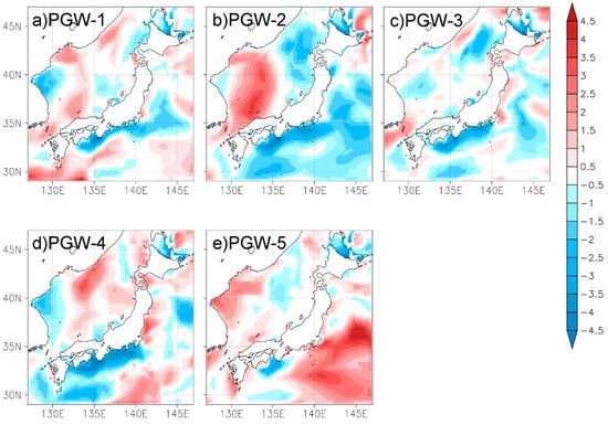 Figure 6 shows the differences in in winter between the future and present climates. In PGW-1, is larger than in the present climate over a wide area of the parent domain. Almost all the increasing tendencies are statistically significant. The results of PGW-5 also show a statistically significant increase in over wide areas. Larger values of in the future are also found in PGW-4 but mainly on the Japan Sea side. In PGW-3, an increasing tendency of is recognized around Japan, whereas no significant increase is evident on the Japan Sea side. Conversely, PGW-2 shows the opposite tendency, but without any statistically significant variation in the coastal area on the Japan Sea side. The patterns of variation are similar to , which indicate the climatology of is controlled primarily by .