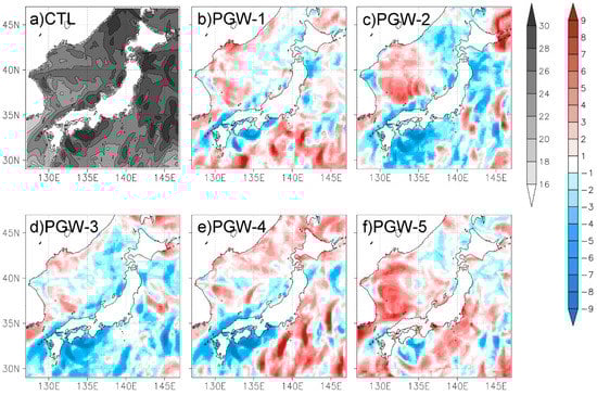 Spatial distribution of maximum wind speed () in the target period. (a) in CTL, and (b)–(f) future variations of in each PGW simulation. Left-hand color bar is for in CTL and right-hand color bar is for future variations of . Unit of color bars is m/s.