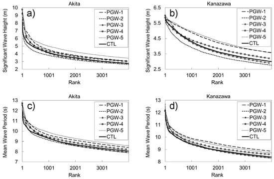 In [], PGW conditions were produced with projections from the five GCMs listed in Table 1. In this study, the wave simulations forced by future projections were named PGW-1, 2, …, 5 with the number of the GCM shown in Table 1. The historical wave simulation (or the results of the present climate) was called CTL.