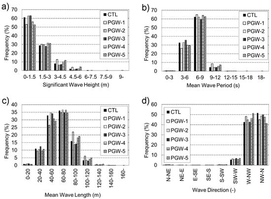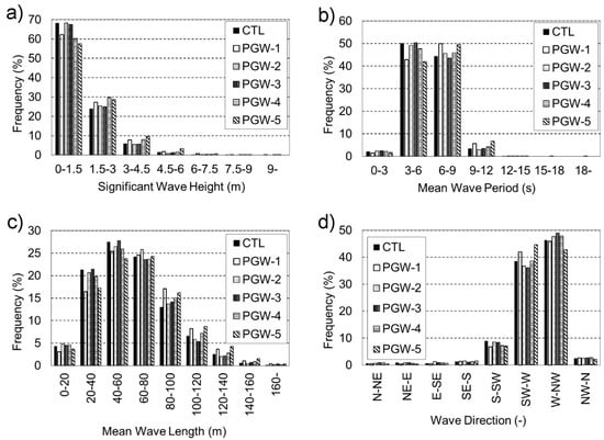 Figure 12 presents the frequency distributions of the wave climate at Akita. The higher class of values of wave characteristics was investigated in Figure 11, whereas variations in the lower class of values are the focus here. The results of Hs show small variations in PGW-2 and 3, but the other three future simulations show an increasing frequency in Hs > 1.5–3.0 m and a decreasing frequency in Hs of 0.0–1.5 m. The results of Tm show an increasing frequency of waves with periods >6 s and a decreasing frequency of waves with periods <6 s in PGW-1, 4, and 5. In Figure 9, PGW-2 does not show an increasing tendency of , whereas Figure 12 does show a slight increase in Tm of 6–9 s at Akita. Frequency distributions of significant wavelength show smaller variations in PGW-3. The results of PGW-1 and 5 show a clear decrease in waves with wavelengths <60 m and a significant increase in waves with longer wavelengths. PGW-2 and 4 also show a decrease in shorter wavelengths and an increase in longer wavelengths but the variations are smaller than PGW-1 and 5. Wave directions also show some differences in the future. PGW-1 and PGW-5 show a clear increase in ocean waves from the SW–W and a decrease in waves from the S–SW and W–NW. It indicates that waves from the west will increase in future at Akita. However, the other three PGW runs do not present any common characteristics.