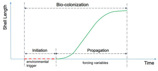 The bio-colonization process depends on two early stages: (1) the reproduction of adults, which spawn in the water column and produce larvae that will become part of the plankton transported by currents; (2) larval survival and development in the water column. The bio-colonization itself starts with the larval settlement on a structure (micro-colonization) and corresponds mainly to the macro-colonization step, i.e., growth of individuals up to the adult state. It is important to estimate the spawning date(s) and to assess the conditions allowing larval survival. This is a prerequisite before modeling macro-colonization. Consequently, the model needs to take into account (1) an initiation phase (no macro-organism present on the structures) with no significant effect on structural reliability, and (2) a propagation phase corresponding to the growth of macro-organisms (Figure 1). With these two phases, an analogy can be made with the dynamic of degradation processes like corrosion of steel rebars in reinforced concrete [17]. In this study, we considered that the larval settlement corresponds to the beginning of the propagation phase.