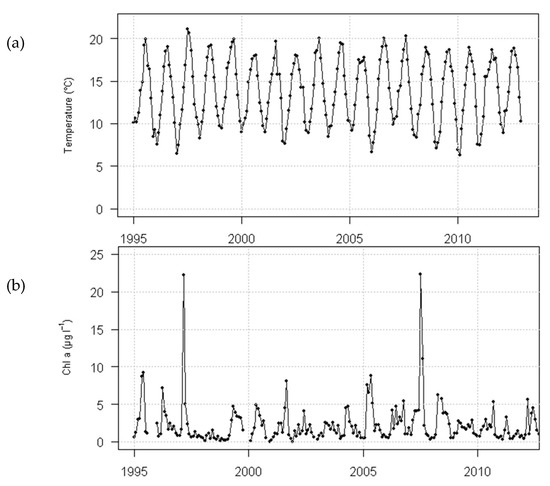 In order to model the initiation and propagation phases, water temperature and chlorophyll-a (Chl. a) concentrations were obtained for the site of Le Croisic (47°17′33″ N, 2°31′15″ W) on the western Atlantic coast of France. This location was chosen for its proximity to the future offshore wind farm site of Banc de Guérande (47°19′41″ N, 2°25′46″ W). Data were collected by the French Observation and Monitoring program for Phytoplankton and Hydrology in coastal waters (REPHY, [33]), and implemented and managed by the French Research Institute for the Exploitation of the Sea (Ifremer). Bimonthly samples were collected at a sub-surface depth (between 0 and 1 m) during high tides between 1996 and 2012 (Figure 2). Chlorophyll-a display higher concentration between March to June corresponding to the spring phytoplanktonic bloom characteristic of northern hemisphere temperate waters. In 2004, a single spring peak was observed, while in 1996, three peaks of lower concentrations were detected. It should be noted that the water temperature cannot change abruptly in a short time. For an overview of the REPHY network, the reader is directed to Hernández Fariñas et al. (2013) [34].