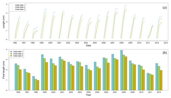 (a) Individual annual shell length trajectories simulated by a mussel Dynamic Energy Budget (DEB) model and (b) corresponding final length.