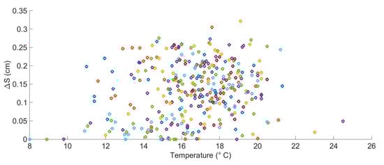 Scatter diagram of the variations of mussel shell length (ΔS) vs. temperature for 10 days periods during the 17 year time series (each color represents a year of the 1996–2012 time-series).