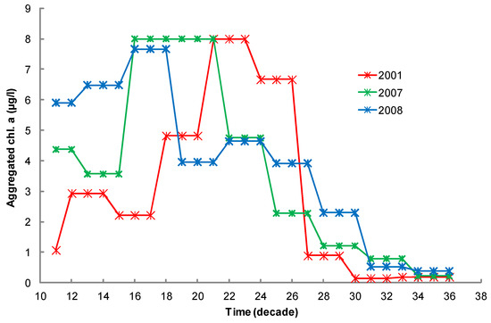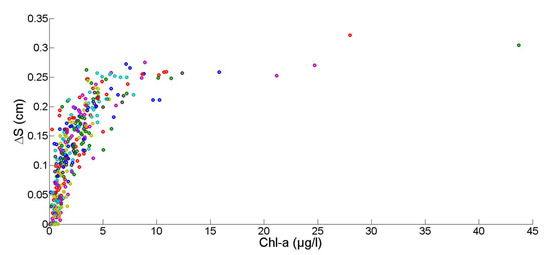 where C(.) is the aggregated Chl. a; T(i), is a 10 day period, and Chl(t), is the linear equation of Chl. a obtained from linear interpolation between adjacent measured values for a colonization period, and n is the number of 10 day time intervals after (i), in which the data aggregation is performed. The best correlation between ΔS and Chl. a has been obtained for a monthly aggregation (3 time intervals, n = 2 in (2)). This time-step preserved the spring bloom typical of the seasonal dynamic of phytoplankton at the study site latitude.