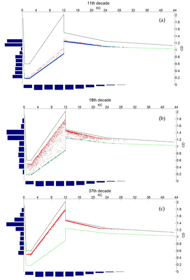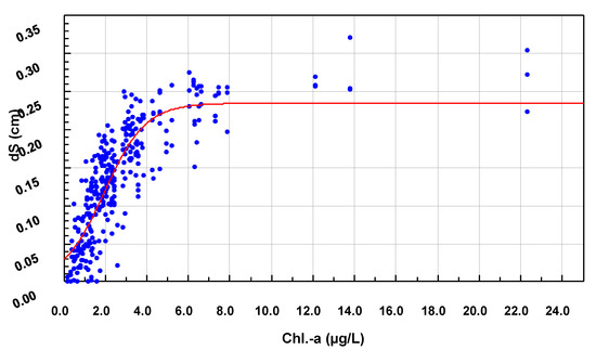 The ratio of (dΔS/dChl. a) ≤2% has been chosen as a criterion for stabilization based on slope variations; this ratio is consistent with the accuracy of the DEB model. A concentration of Chl. a of 8 µg·L−1 was identified as the threshold beyond which ΔS remained constant at 0.235 cm/time interval. The Chl. a time-series was then truncated with the mentioned threshold to significantly improve the convergence of the Gamma process parameterization, without an important degradation of the database. Note that this threshold depends on the metabolism of the organism and is, therefore, species-specific.