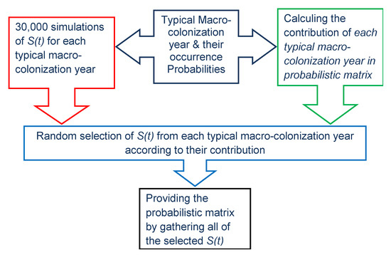 Hereafter, Tit,τ, is used for the initiation phase determination and Cit,τ for the modeling of the propagation phase. Four types of larval development combining the slow (S) and fast (F) growth possibilities are presented in the Table 1 for the three initiation times (corresponding to the three spawning periods) obtained from the database considering key factors and thresholds described in the previous section. The first larval development is always slow because the water temperature is below 14 °C during early spring, and the third one can be slow only if the second one is also slow (because the water temperature cannot fluctuate abruptly). These results come from the natural seasonal variations of temperature during one year. These frequencies will be considered as discrete probabilities for the modeling. At the end of this larval growth period, we considered that larvae settled on the structures, and that was the start of the propagation phase (macro-colonization) described in Table 1 for the 17 annual chronicles.