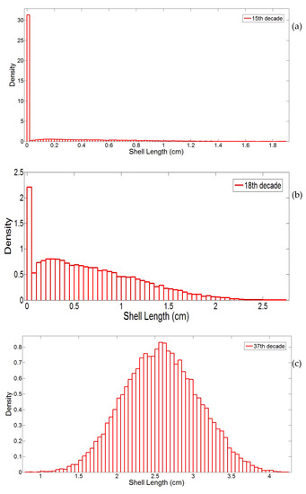 where St,τ is the shell length for each time interval of τ and αS and βS are the shape and scale functions of the Gamma process, respectively. To simplify the modeling of this process, it has been assumed that the scale function βS was constant and Gamma process was only governed by the shape function [11].
