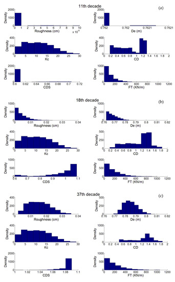 For roughness, on the one hand, there is a lack of on-site measurements and on the other, the available relationship between roughness and hydrodynamic forces (9) relies on a uniform roughness around the component [3]. Hence, roughness is also modeled as a Gamma process kt,τ based on individual shell length time-series St,τ (11), with a random factor following a uniform distribution with support [0.2; 1]. The latter is a model error for modeling the uncertainty when quantifying the real effect of a randomly distributed roughness around the component. Note that intensive developments on underwater image processing are emerging [54,55,56], enabling one to envisage progress in on-site measurements. Recent works investigate the relationship between non-homogenous roughness and loading [57,58]. The wide range of uncertainty will, therefore, decrease in the next decade. Consequently, the error of computation of equivalent roughness is significant and the interval in (11) is large: it includes the stochastic distribution of shells around a tubular component and the error of model for computing the equivalent roughness.