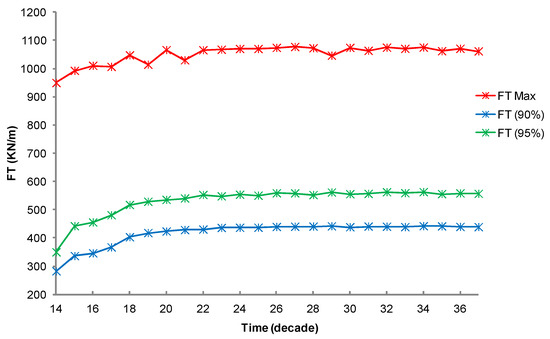 Evolution of FTmax, and 90%, 95% fractiles with time.