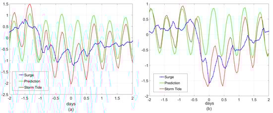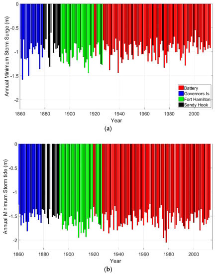 The annual minimum storm tides between 1860 and the present range from −2.05 m to −1.24 m (relative to local mean sea level) with a standard deviation of 0.15 m, whereas annual minimum storm surges range from −1.64 m to −0.68 m with a standard deviation of 0.18 m. By comparison, the measured range for positive storm tides and positive surges is 1.15 m to 3.38 m (standard deviation of 0.25 m), and 0.58 m to 2.67 m (standard deviation of 0.30 m), respectively (compare to [9,41]), where the large difference is caused by tropical cyclones. If only the non-hurricane season is considered (December through May), the Extra Tropical Cyclone (ETC) range for positive storm tide events is +1.19 m to +2.17 m (standard deviation of 0.19 m); hence, empirical data suggest a slight tendency for positive extratropical surges and storm tides to be larger than magnitude of negative surge and storm tides. The historical time series of annual minimum negative surge (Figure 4a) shows that extreme negative surges are weakening or are becoming ‘less frequent’ over the century. However, the historical time series of annual minimum storm tide (Figure 4b) does not show any apparent trend.