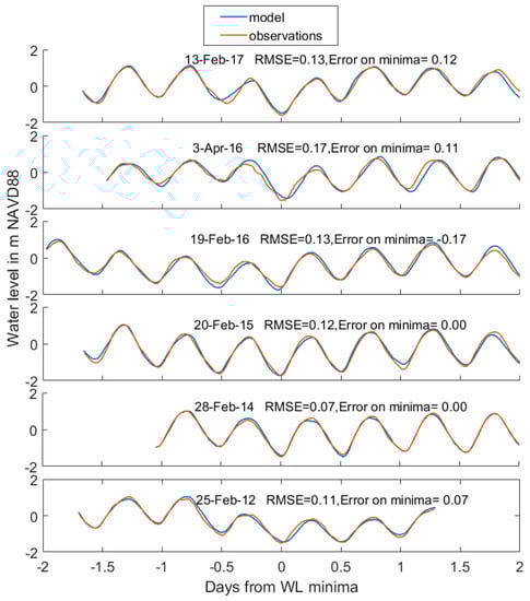 To specifically evaluate the model’s capability to forecast and capture the mechanics of a blowout, the model is validated for six blowout events that occurred between 2012 and 2017 (Figure 3). The meteorological forcing for these simulations is obtained from forecasts created by NOAA from the Weather Research and Forecasting (WRF) model’s North American Mesoscale (NAM) domain application [40]. Streamflows, initial conditions, ocean boundary conditions, and model settings are all taken directly from operational NYHOPS forecast simulations [31,36,39]. This includes a high level of detail, with forecast data for 93 tributaries (National Weather Service Northeast River Forecast Center) and 426 other estimated freshwater and heat inputs within the domain. The model simulations compute the water levels beginning 24 hours before the peak of each blowout event. Raw model results are evaluated with a mean bias correction (the mean amplitude across events was 5 cm), which helps capture unresolved low-frequency sea level variations (e.g., seasonal variations [33]). This has little effect on our evaluation of the model’s capacity to capture the mechanics of negative surge.