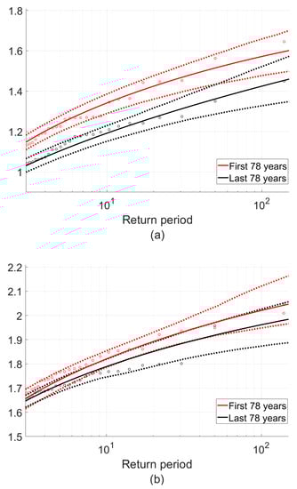 Statistical extreme value analysis is performed on the historical data to evaluate the long-term change, with the 154 years of data divided into two periods to qualitatively represent ‘past’ and ‘present’ versions of the harbor. The corresponding data of annual water level (AMnST) and surge (AMnSS) minima are then fit with generalized extreme value (GEV) distributions, with 95% bootstrapped confidence intervals and the water levels and corresponding return periods are compared for the two periods (Section 4.1).