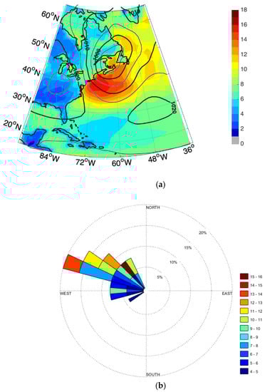We investigate the meteorological conditions leading to blowouts by looking at the top 25 negative surge events from 1979–2014 in two ways by—(1) creating regional composite (average across events) 10 m wind velocity and sea level pressure data using meteorological reanalysis data [27] and (2) analyzing hourly wind observations at Newark Airport for the same set of events. The composite analysis of blowout events uses “ECMWF ERA-Interim 15” reanalysis data available back to 1979 from the NOAA Center for Operational Oceanographic Products and Services [28]. The 25 most negative surge events between 1979 and 2014 are identified in the hourly surge data, ensuring event independence by requiring that none of the 25 events occur on consecutive days. After identifying the time of the event, the hour of the event is rounded to the nearest 6-h interval (i.e., 00Z, 06Z, 12Z or 18Z) to enable matching of the surge event to the 6-h meteorological data.