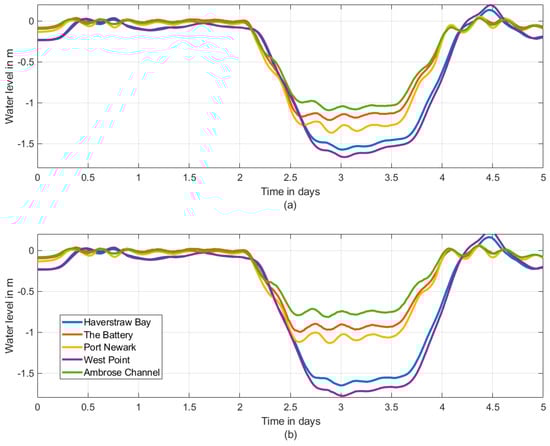Other factors, such as changing atmospheric parameters like wind speed, and atmospheric pressure, could also contribute to the evolution of negative surges, but we do not explore them in this paper. We also note that changes to damping within an estuary (caused by depth changes) often produce a large shift in tides and storm tide magnitudes (e.g., [13]). In NYH however, tides are not significantly damped, and changing bathymetry has only slightly altered the tidal range as can be seen in Figure 9c (also in [11]).