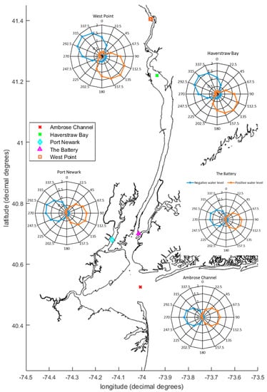Interestingly, the magnitudes and directional sensitivity of positive and negative surges are near-mirror images of each other, suggesting that the physical controls on each are similar. Hence, asymmetries in estuary depth and wetted area (due to hypsometry) appear to play little role in setting negative and positive storm tide magnitudes, within the channel locations shown in Figure 8. This likely results from the Hudson being a relatively channelized and deep estuary, with only a small percentage of shallow areas (i.e., mean depth below 4 m) or intertidal zones. A similar result was shown by Drews [44] for the Gulf of Aqaba in Red sea basin.