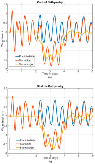 From these considerations, we see that the largest apparent negative storm surge occurs when the residual is most negative, i.e., during a rising tide. This can be seen in historical time series data (e.g., Figure 2) where the surge minima often occur on a rising tide. The same is also observed in the model results for the bathymetric sensitivity analysis in Figure 9a,b).