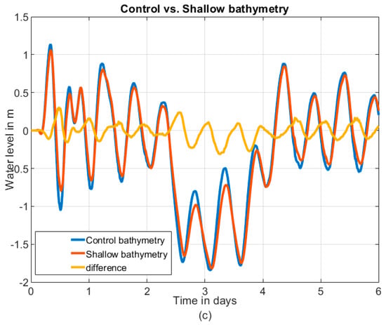 Time series of water level (storm tide) and surge during a blowout event using a random tide. Panels show: (a) simulation results for a tide/west wind simulation with control bathymetry; (b) results with shallow bathymetry; and (c) time series of total water levels for control bathymetry and shallow bathymetry, and the difference between the two.
