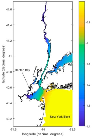 - The historically-dredged shipping channels at the harbor entrance areas of Raritan Bay and Lower New York Bay south of latitude 40.56° N (Figure 1b) are shallowed in the model by setting the depth of the grid cells in the sections of the shipping channels deeper than six meters equal to six meters. This value is the approximate pre-dredging average bathymetric depth across the Ambrose Channel area, estimated from the Hassler Chart of NYH [18].