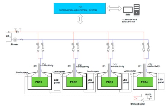 A scheme of four photobioreactors (PBR). Temperature, air/CO2 bubbling, pH, light intensity and diurnal cycle are controlled by the supervisory control and data acquisition (SCADA) system.