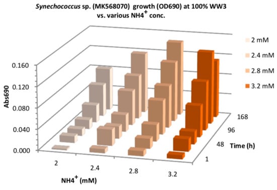 In the microwell plates we tested the Synechococcus sp. MK568070 growth potential in a range of NH4+ concentrations (2–3.2 mM) corresponding to annual fluctuation of NH4+ in the refinery wastewaters. The working medium in microwells was WW3 adjusted by dilution or amendment of nutrients as described in Section 2.3 of the materials and methods section. The results are presented on Figure 2.