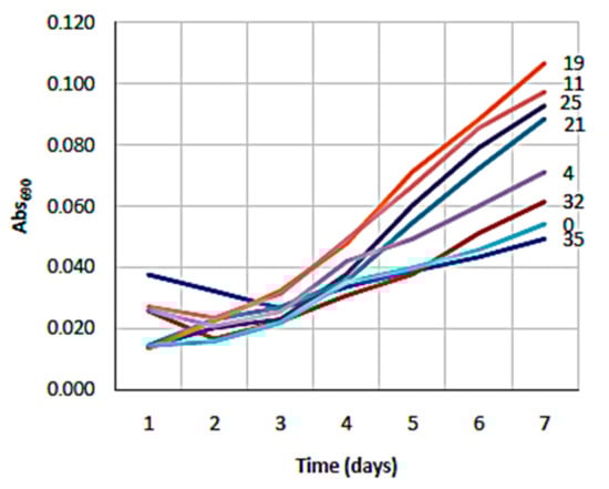 Salinity test in microwells was performed over Synechococcus sp. MK568070 and the results are presented on Figure 3. Synechococcus sp. MK568070 was incubated for a week in a standard growth medium with a range of salinity from 0 to 35 and OD690 was measured daily. High cell densities were reached in the range of salinities from 11 to 25, whereas salinities below 11 and above 25 inhibited cellular growth (Figure 3).