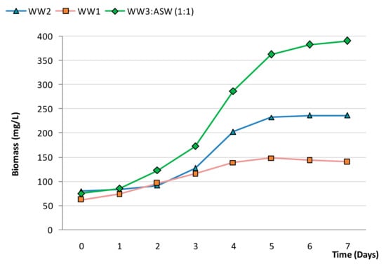 Biomass growth of Synechococcus sp. MK568070 when cultured in different wastewaters: WW1 (c (DIN) = 0.8 mM), WW2 (c (DIN) = 0.8 mM) and WW3:ASW (1:1; c (DIN) = 1.3 mM).