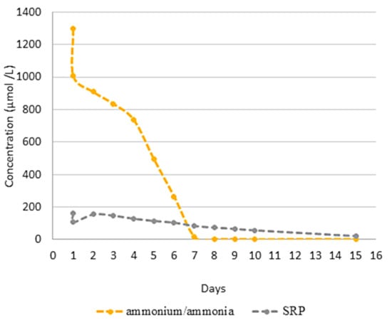 Aliquots (50–100 mL) were sampled daily for dissolved nutrients determination. Nitrate (NO3−), nitrite (NO2−), ammonium/ammonia (NH4+/NH3), soluble reactive phosphorus (SRP) and dissolved organic phosphorus (DOP) were analyzed from the supernatant after the immediate centrifugation (10 min, 5000 rpm) of the collected samples. We followed the procedures described by Parsons et al. [], and Ivančić and Degobbis [], including the appropriate dilutions of the samples to fit the range of spectrophotometric determinations using Shimadzu UV 1800 at the path length of 1 cm for each method. Dissolved inorganic nitrogen (DIN) concentration was calculated as the sum of NO3−, NO2− and NH4+/NH3 concentrations.