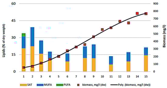 The most abundant fatty acid was C16:0 with a 43.04% mass fraction of total fatty acids at the end of the experiment in the stationary growth phase. Due to the high percentage of other saturated fatty acids (C14 and C18) profiles are characterized with an overall unsaturation index (UND) lower than 1. The lowest UND of 0.45 was observed at the end of the experiment. The proportion of summarized C16 FA maintained high relative values, with decreasing dynamics in the exponential phase of the experiment and then again increasing the proportion towards the end, finally reaching the final 66.06%.