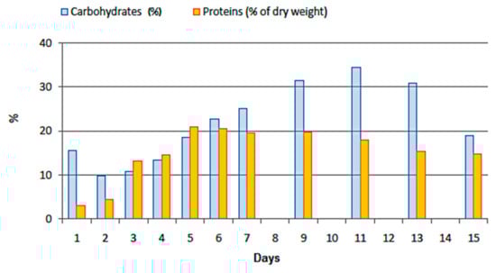 Carbohydrate and protein content were measured daily during the first seven days of experiment, and later on every 2nd day. The results are presented in Figure 7.
