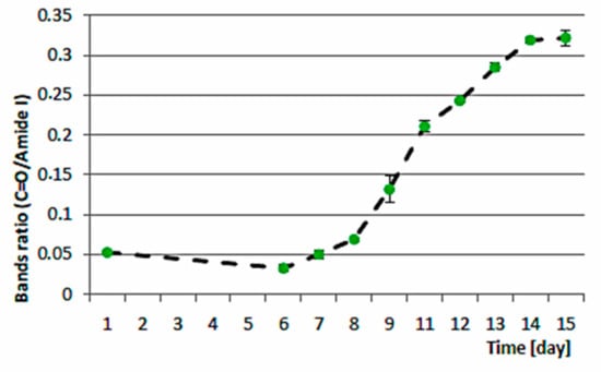Spectroscopic tests were performed using a spectrophotometer FTIR Tensor II (Bruker, Karlsruhe, Germany) with an attenuated total reflectance (ATR) accessory with a diamond crystal. Equal volume (30 mL) of each sample was filtered on 0.4 µm PC filters (Whatman) and dried at 60 °C for 12 h. Samples were placed in the sampling accessory obtaining the best contact with the crystal. The approximate total time required for spectral collection was 5 min. All spectra were recorded within a range of 4000–800 cm−1 with a 4 cm−1 resolution. Each spectrum was calculated as the average of 40 scans and subjected to background subtraction. Analyses were carried out in triplicates. ATR spectra taken in different growth phases were compared according to the following: Base line of all spectra is corrected by means of Opus Spectroscopy Software 7.5, the absorption values of the absorption bands (v C=O and Amid I) are read. The proportion of v C=O and Amid1 are used as representative bands for lipids and proteins, respectively. The ratio between the two absorption bands is indicative of the biochemical composition changes and relationships between the molecule classes [].