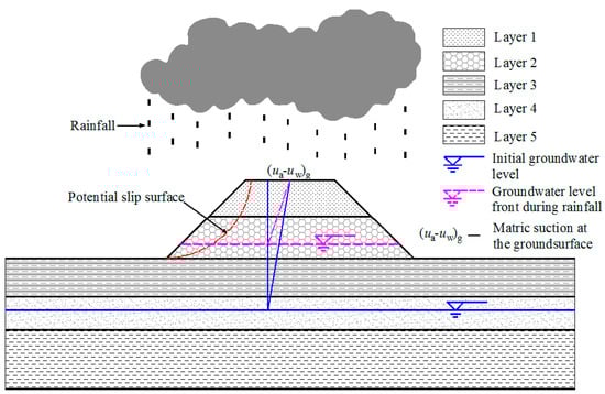 Cross section of unsaturated multilayered coastal-embankment slope under rainfall infiltration.