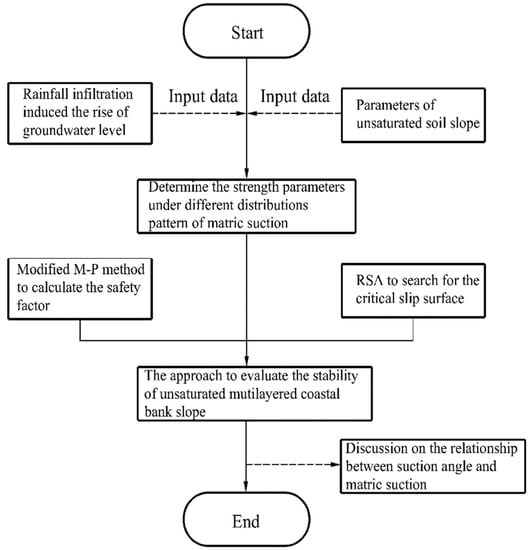 It should be noted that the stability of coastal-embankment slope with the unsaturated and multilayered feature during rainfall were greatly different from those of dry or saturated soils and should be investigated by a simple and effective approach in consideration of effect of matric suction distributions and underground water levels. As a consequence, in the framework of this research (shown in Figure 2), the influence of rainfall infiltration on unsaturated-soil slope was simulated by the gradual rise of the groundwater level and strength parameters under different distributions of matric suction were determined. Then, the M–P method was modified to investigate the safety of the unsaturated multilayered coastal-embankment slope by combined the rigorous limit equilibrium theory with failure criterion of unsaturated soil. Furthermore, the RSA developed by Malkawi’s method [40] was adopted to locate the critical slip surface of the unsaturated multilayered coastal-embankment slope. Finally, the failure process under the rainfall infiltration was reproduced by searching for the critical slip surface and the associated safety factor, on which the effect of distribution of the matric suction was also investigated. In addition, the influence of the determined method of suction angle on the safety factor is discussed in detail.