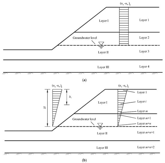 where c’i, φ’i(j = I, II, III) = the strength parameters of the original soil layers; (ua-uw)g = the matric suction at the ground surface; Ci, φ’i (i = 1,2,…,m+n+2) = the strength parameters of the divided small layers; H = the distance between the groundwater level and the top of the slope, hi (i = 1,2,…,m+n+2) = the distance between the ith small soil layers and the top of the slope.