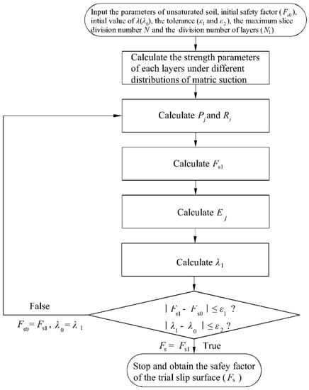 where Fs = the safety factor of the trial sliding surface; λ = the scaling factor; Ej-1 and Ej = the inter-slice force for slice j-1 and j; Wj = the weight of jth slice; Qj = the external loading; Sj = the shear force; Nj = the normal pressure; uj = the pore-water pressure at slice-base; φ’j and Cj = the mobilized internal friction angle and total cohesion along; fj-1 and fj = the inter-slice force function for slice j-1 and j which can be determined by relating them with the horizontal coordinate. Other detailed information about the model parameters can be found in Reference [34]. The safety factor of a trial sliding surface in the unsaturated multilayered coastal-embankment slope can be performed as shown in Figure 5.