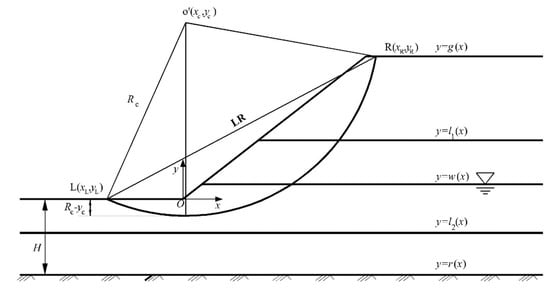 As a typical failure mechanism in practical geotechnical engineering, circular sliding surfaces are widely employed in the stability analysis of saturated soil slopes with both single layer [45,46,47] and multilayer [34,48,49]. Then, the aforementioned problem of determining a trial circular failure surface can be represented by locating the two control intersections (L(xL, yL), R(xR, yR)) and a radius (Rc) shown in Figure 6, in which the potential sliding surface should be addressed in order to satisfy the boundary conditions represented by y = g(x) and y = r(x), the hydraulic conditions y = w(x) and the discontinuity between the layers demonstrated by y = lj(x). Then, the potential sliding surface represented by S can be expressed as functions of xL, yL, xR, yR and Rc in the following form: