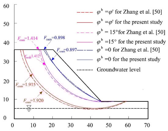 As shown in Figure 8, the critical slip surfaces predicted by both models become gradually deeper and their associated minimum safety factors progressively decrease with the increase of φb. This is because of the amplification of φb which significantly increases the total cohesion (shown in Equations (3)–(8), and enhances the shear strength (Equation (2)), which in turn improves the safety factor. Moreover, both the critical slip surfaces (marked by the solid line) and the associated safety factor always agree well with those (marked by other line type) predicted by Zhang et al. [50]. Therefore, the present method performs well in investigating the stability of the unsaturated-soil slope.