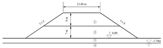 When the rainfall is heavy enough to overcome the hydraulic conductivity of the sub-layer, the groundwater table will move upward gradually; however, assuming capillarity rising to the ground surface, the distribution depth of matric suction will decrease until the soil becomes fully saturated, as depicted in Figure 1. Moreover, the density of Layers 2–3 will lose the effective density from its natural pattern and the pore-water pressure will decrease with the associated reduction in the effective stress. Then, the shear strength of soil will drop and the stability of the soil slope will in turn deteriorate. Actually, the effect of rainfall on stability of unsaturated-soil slope is dependent on many of factors (rainfall amount, average intensity, duration, pattern, vegetation) [16,19,41]. For more detailed investigations, it is necessary to address the soil-water profile with 1-D or 2-D infiltration model to address the effect of infiltration on unsaturated-soil slope’s stability [42], which will make the problem become more complicated, laborious and computationally expensive [43]. Since the groundwater level will gradual rise during long-term rainfall infiltration, the effect of rainfall on the unsaturated coastal-embankment slope can be alternatively reproduced by the progressive elevation of the groundwater level without considering the interaction between soil and water. For the sake of simplicity, the phreatic line is assumed to be horizontal in this study as shown in Figure 1.