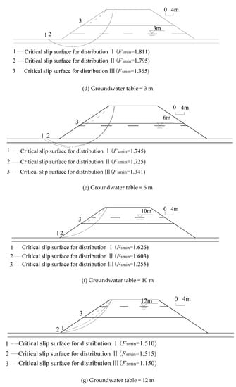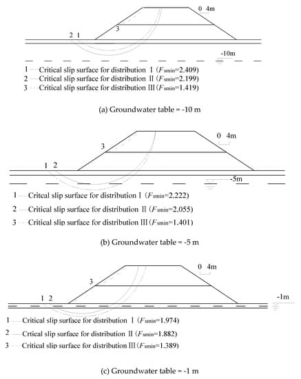 (2) The most dangerous sliding surface of Distribution III is always located at the shallow depth of the slope and it is independent on the fluctuation of the groundwater level. Unfortunately, these results do not coincide with the practical results. The location of critical slip surface of Distribution I and Distribution II are close and both of them change from deep slip to shallow slip with the rising of the groundwater level and these predicted results coincide well with the practical results.