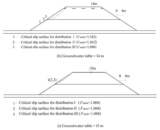 (1) There is an apparent discrepancy among Distribution I, Distribution II and Distribution III with respect to the critical slip surfaces. The critical slip surfaces associated with the above three distributions do not coincide until the groundwater level reaches the top of slope in which the soil is fully saturated.